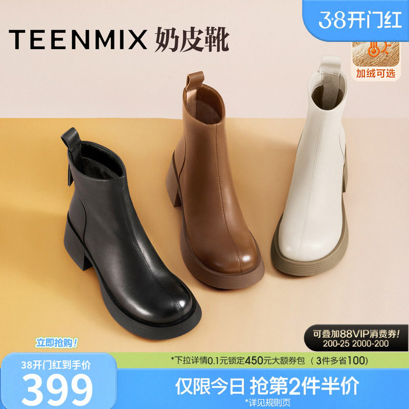 天美意厚底英伦奶皮靴加绒切尔西短靴女鞋子时装靴皮靴2025冬新款
