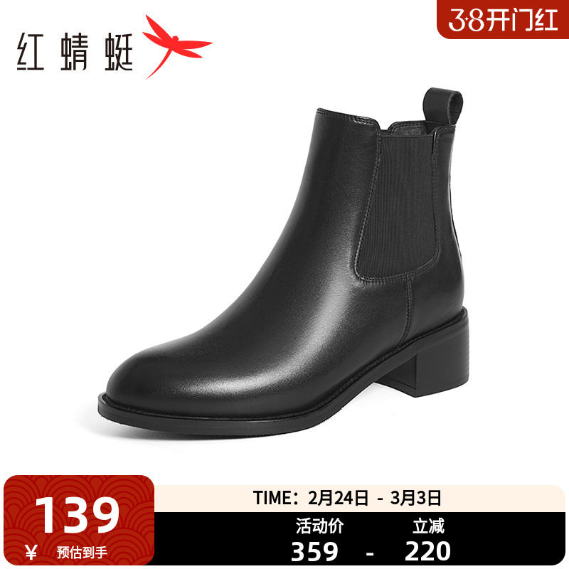 红蜻蜓切尔西短靴秋冬新款女粗跟增高烟筒靴气质通勤瘦瘦靴子女鞋