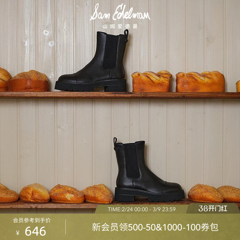 明星同款SAM EDELMAN山姆爱德曼冬黑色圆头粗跟切尔西短靴女REETA