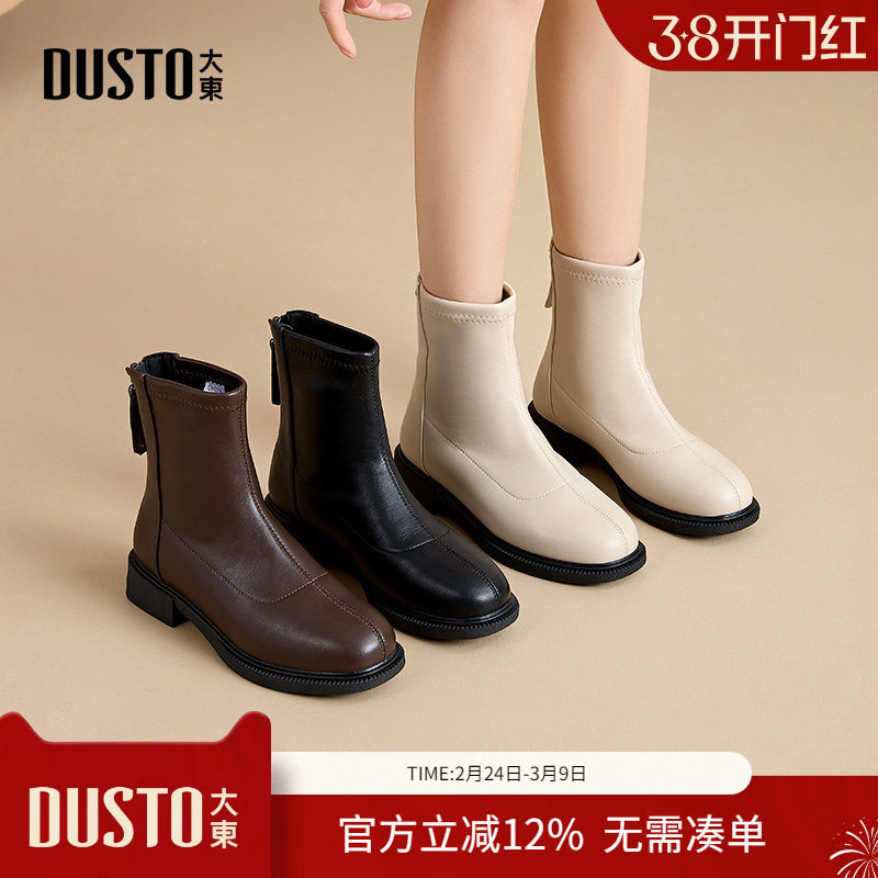 达芙妮方头短靴女2026新款冬季加绒切尔西皮靴平底瘦瘦靴子马丁靴