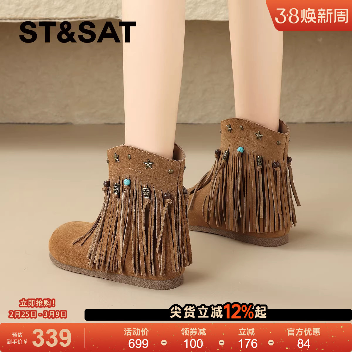 星期六美拉德流苏棕色靴子女靴2025秋冬新款复古厚底切尔西短靴子