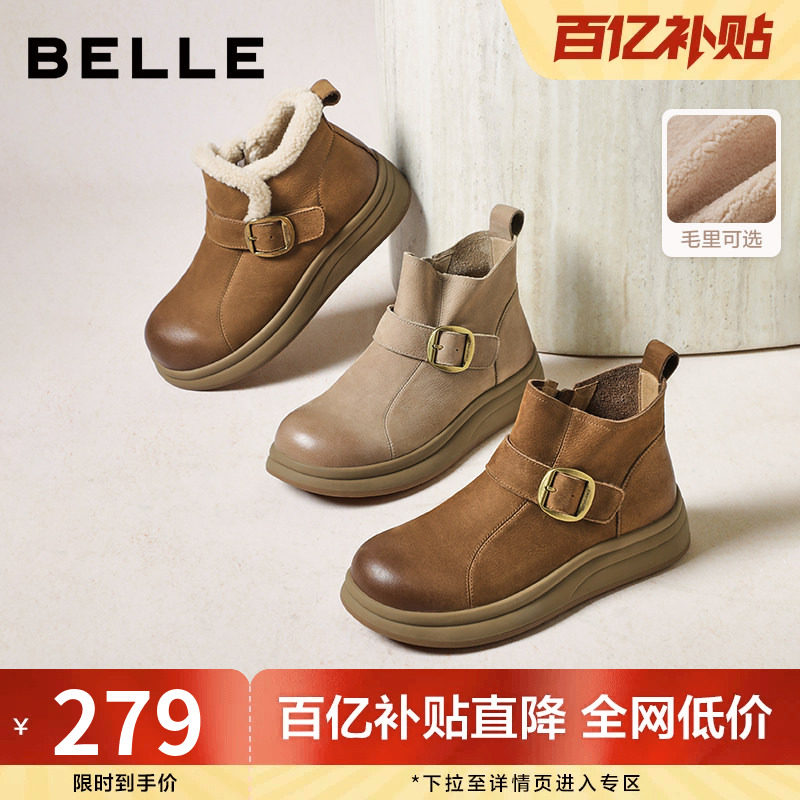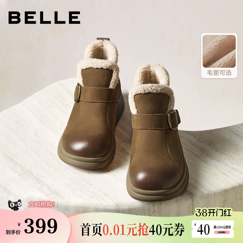 百丽加绒保暖棉鞋休闲靴子女冬款真皮厚底切尔西短靴E5D1DDD5