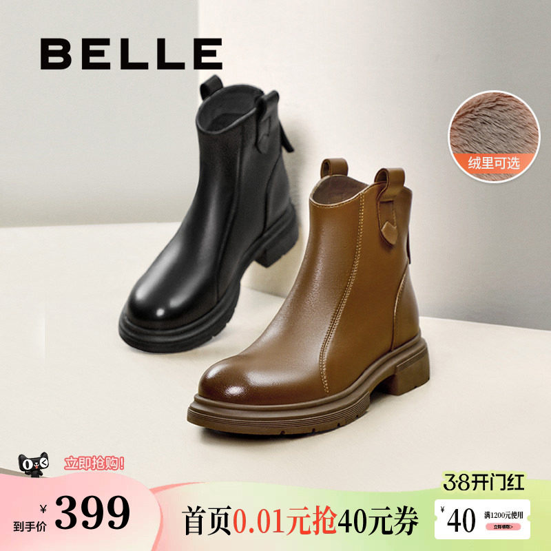 百丽女靴冬季新款瘦瘦短靴加绒时装靴超软羊皮切尔西靴B7E1DDD5