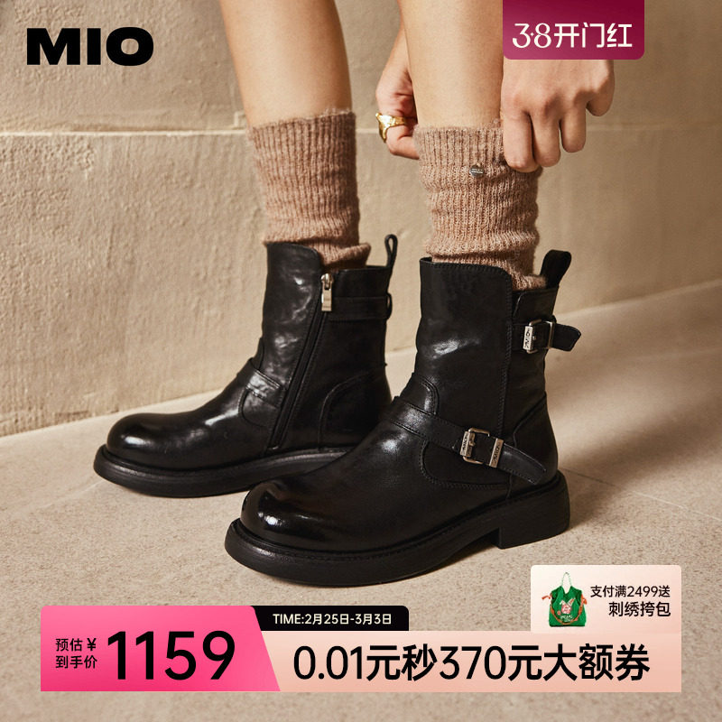 MIO米奥加绒褶皱马丁靴金属粗跟靴子冬新款女鞋牛皮革切尔西短靴