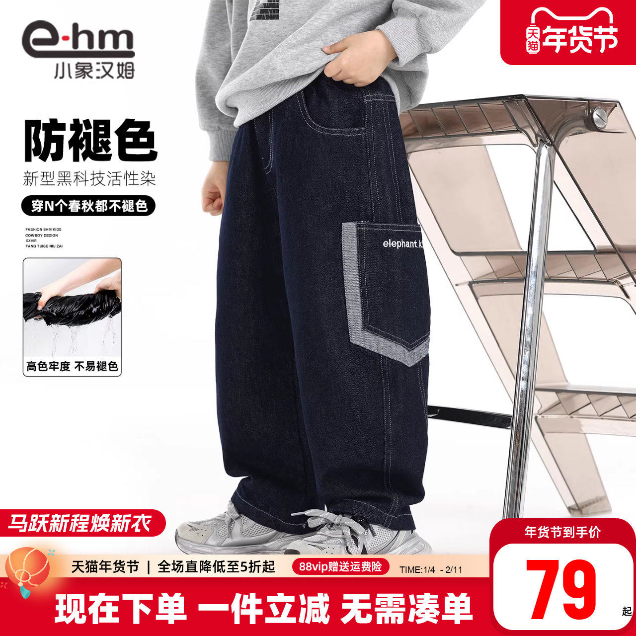 小象汉姆童装男童牛仔裤防褪色裤子儿童弯刀宽松裤子2026春装新款