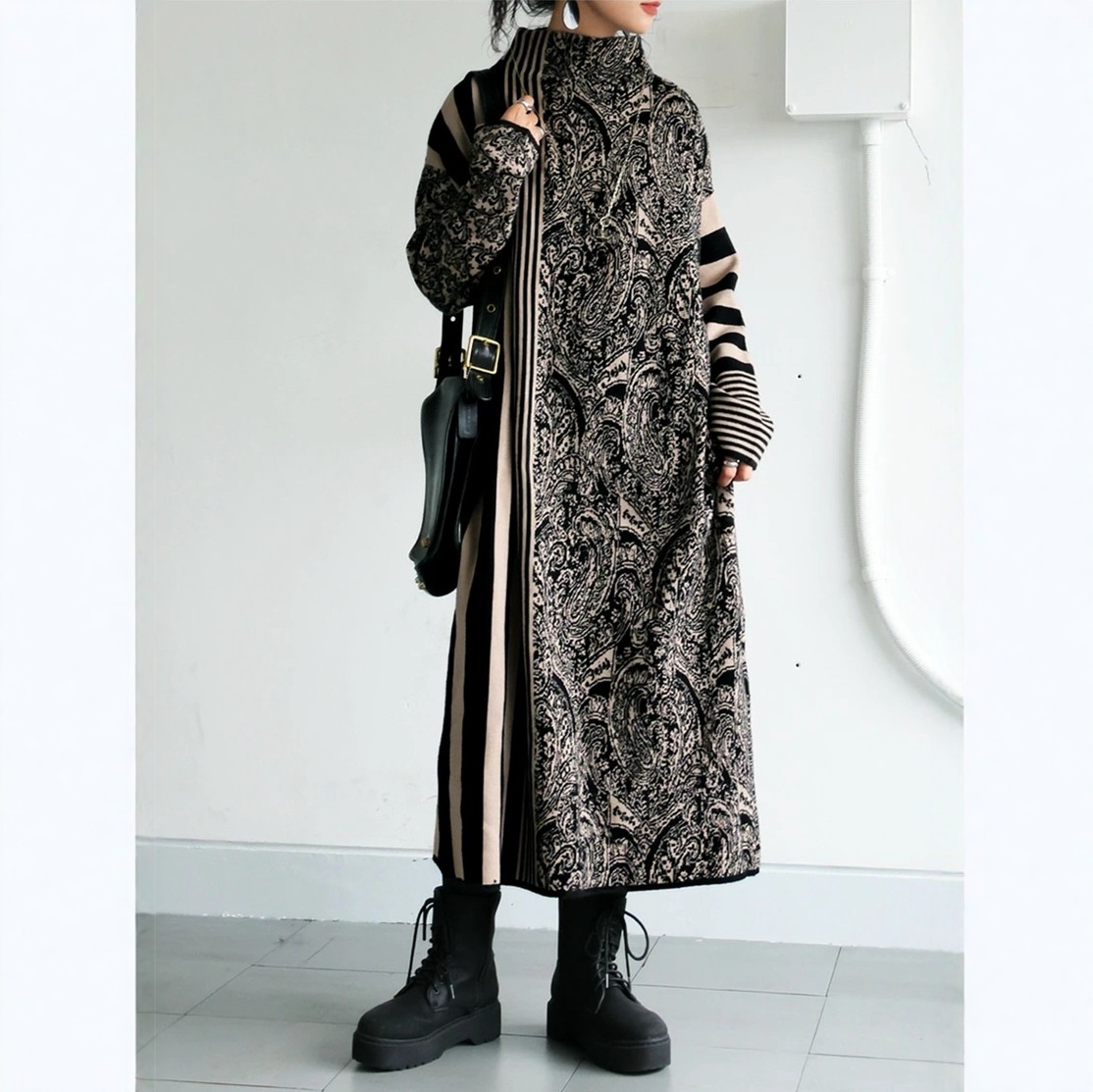 2025新款佩兹利花纹条纹柔软触感保暖利落优雅宽松针织长款连衣裙