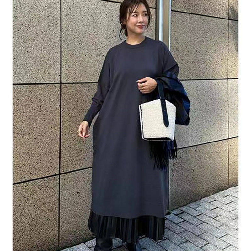 日系外单 大尺码女士圆领套头针织长款连衣裙过膝宽松裙子24074