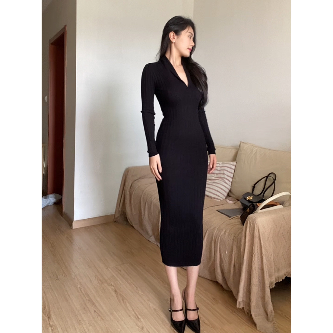 Sun雅乔【华尔兹王妃】春冬网红风V领打底收腰长袖针织长款连衣裙