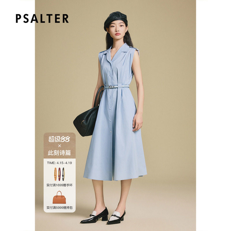 诗篇专选浅蓝色法式宽肩无袖褶涧立体收腰衬衫连衣裙2025春款