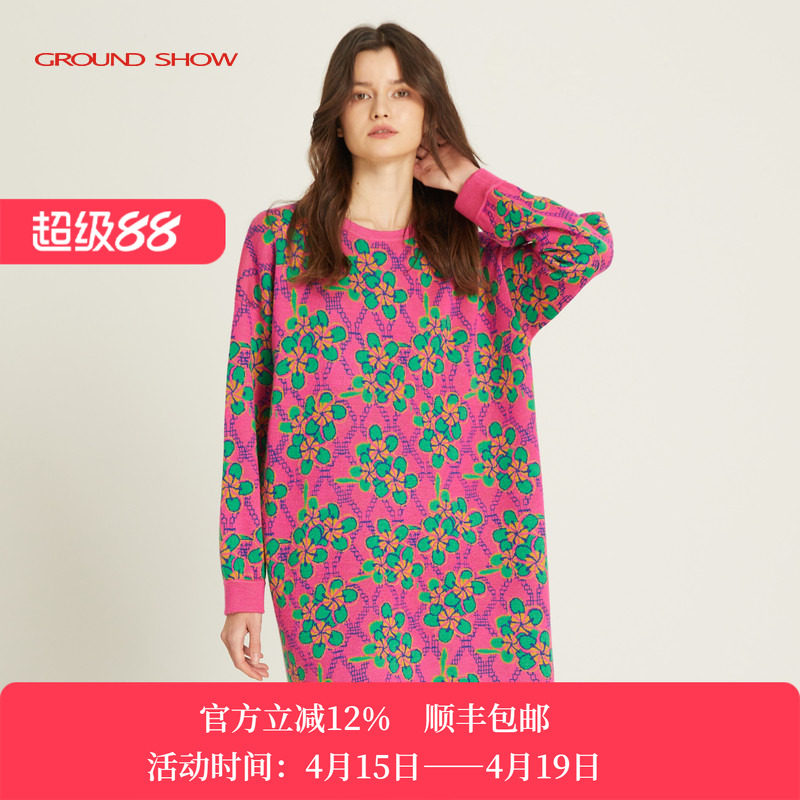 【丝光羊毛混纺】阁兰秀玫紫色气质提花针织连衣裙套头宽松女春款