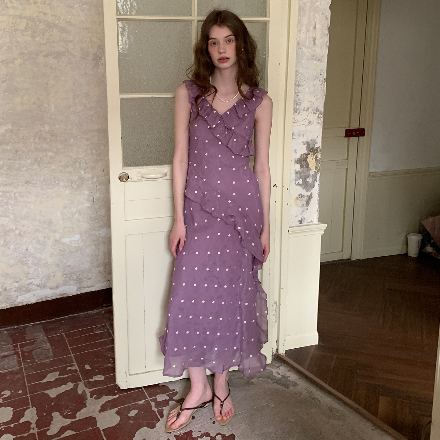 ZHUYIYI 原创高级感新款法式波点荷叶边薄纱吊带连衣裙女春款长裙
