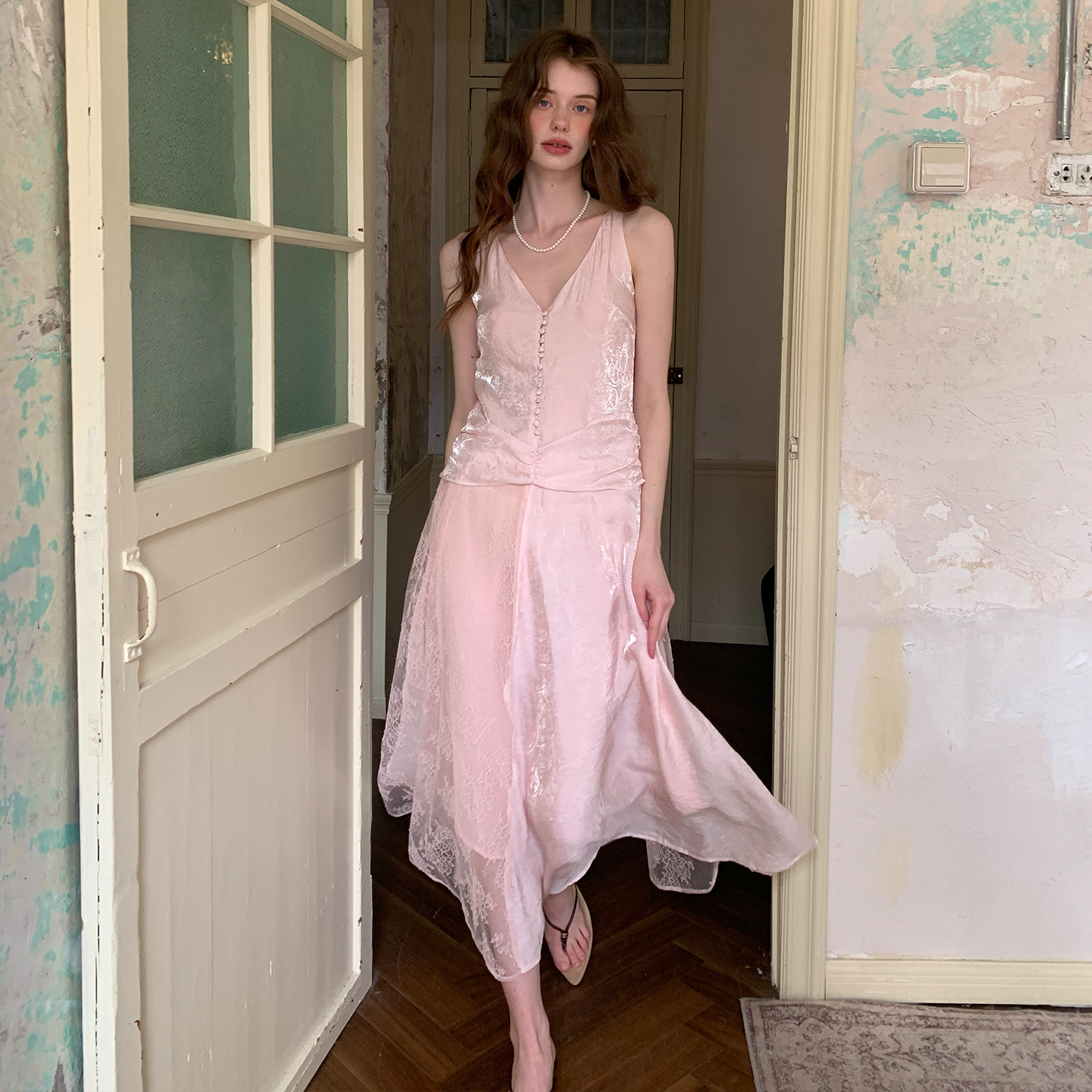 ZHUYIYI 新款法式春季薄纱蕾丝背心式连衣裙女春款原创设计长裙