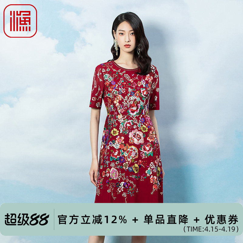 渔牌女装春款女装2023年新款雪纺满底重工国风绣花连衣裙FGFA0128