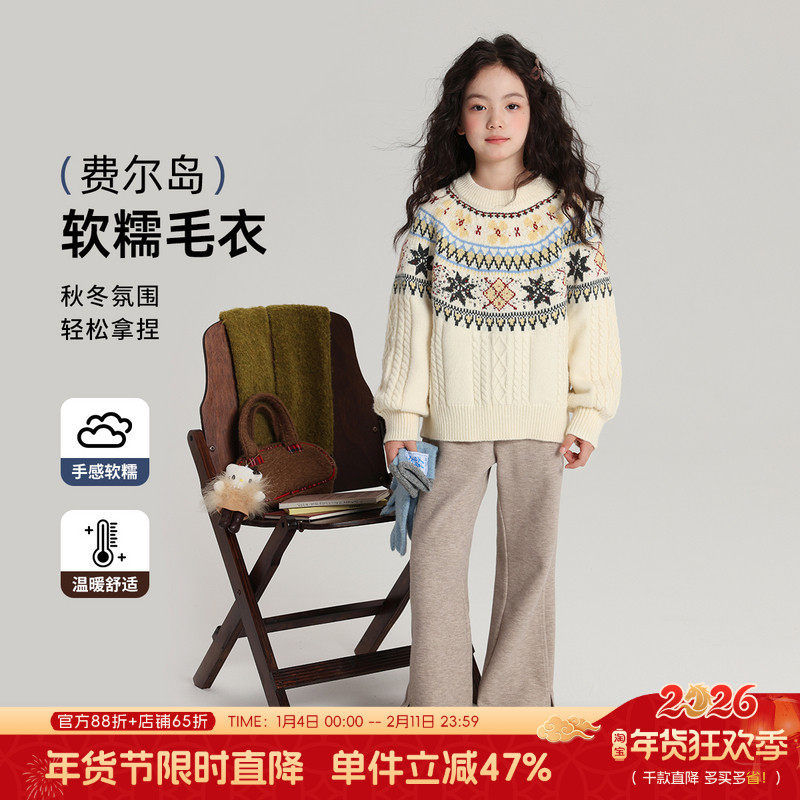 布丁哈鲁冬装童装女童洋气上衣2026秋冬款儿童宽松休闲费尔岛毛衣