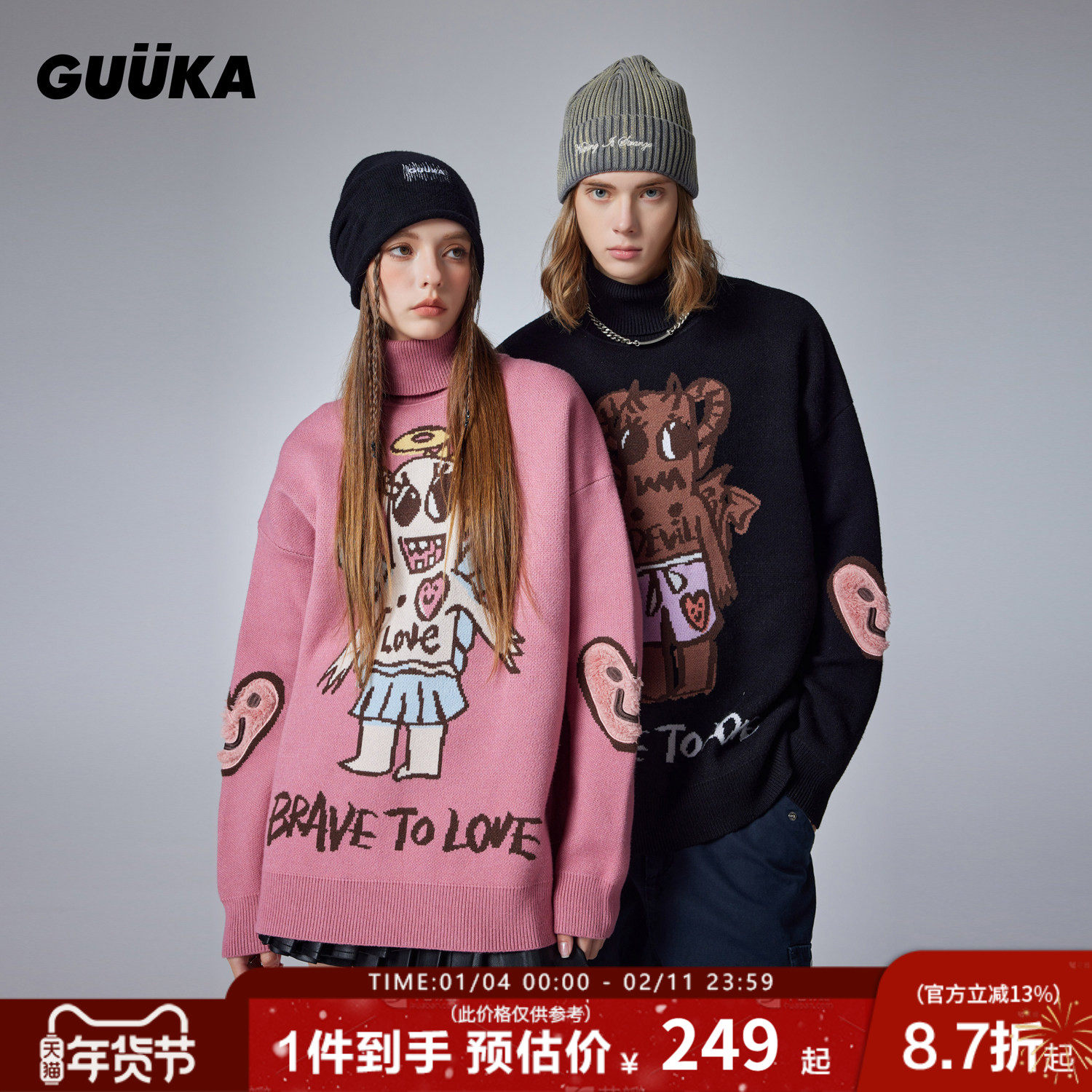 GUUKA潮牌黑色高领毛衣男秋冬款 情侣仿貂毛爱心粉色针织衫女宽松