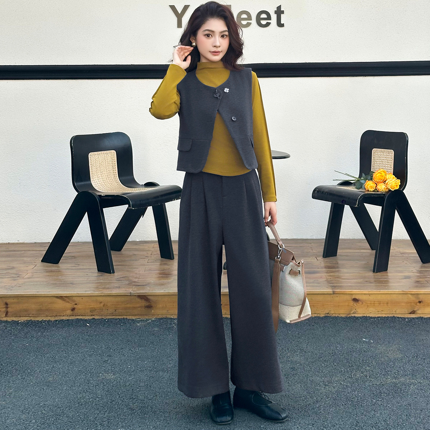 时尚洋气质毛呢料套装女秋冬新款韩版短款马甲阔腿裤打底衫三件套