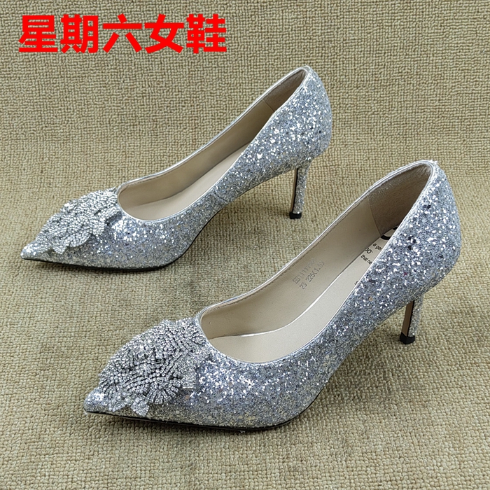 3538码正品撤柜断码清仓处理春季新款尖头烫钻细高跟浅口女单鞋潮