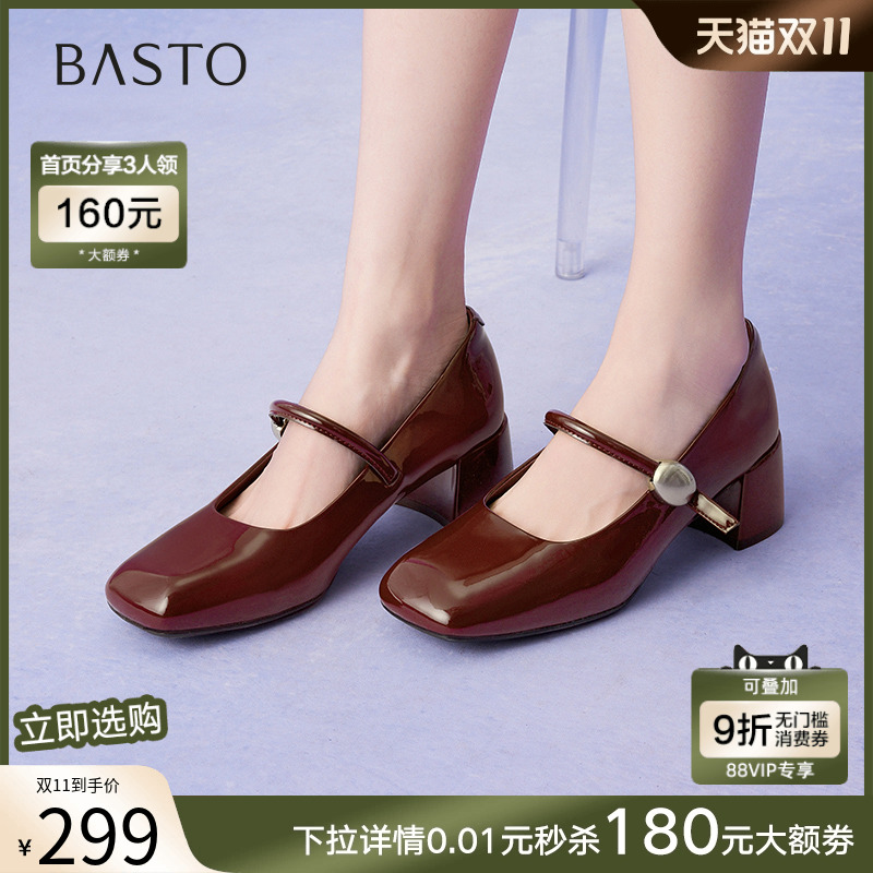 百思图25秋商场新款法式红色玛丽珍鞋粗跟浅口女单鞋婚鞋F2166CQ5