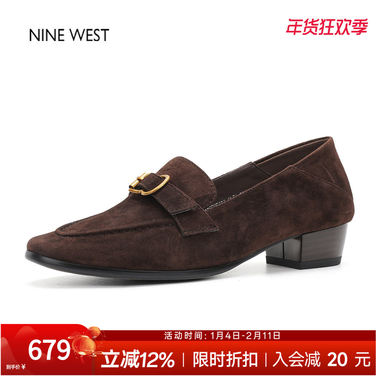 奥莱专供Nine West/玖熙真皮一脚蹬乐福鞋秋方头皮鞋粗跟单鞋女款