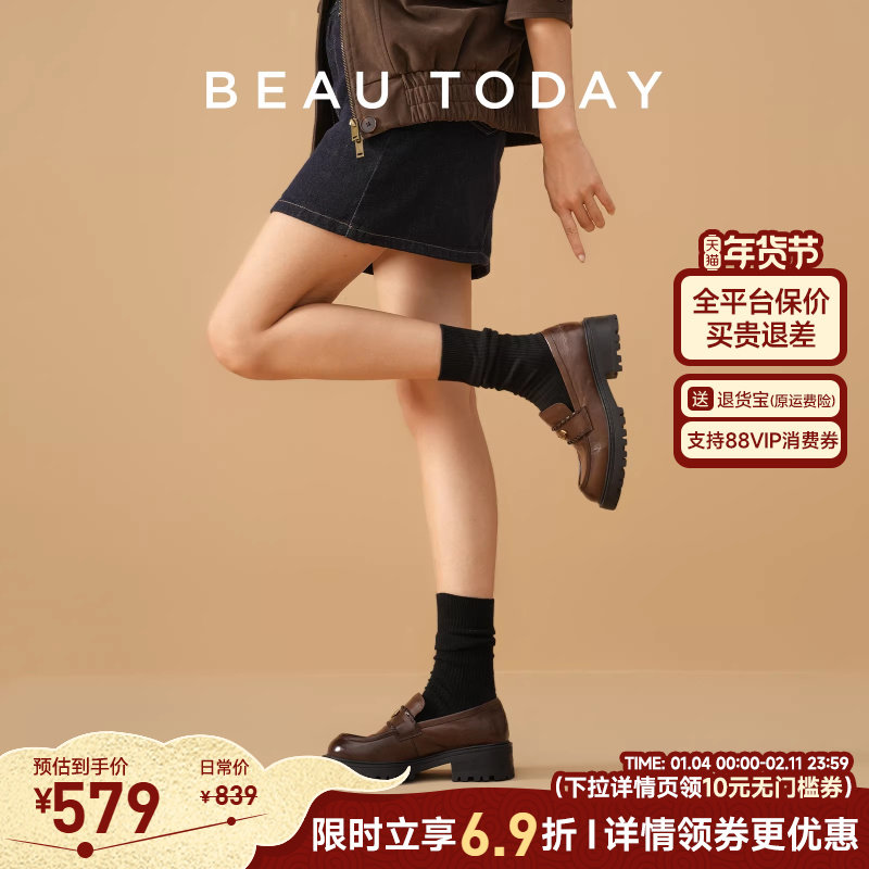 BeauToday厚底乐福鞋女款2026新款棕色小皮鞋一脚蹬粗跟单鞋女鞋