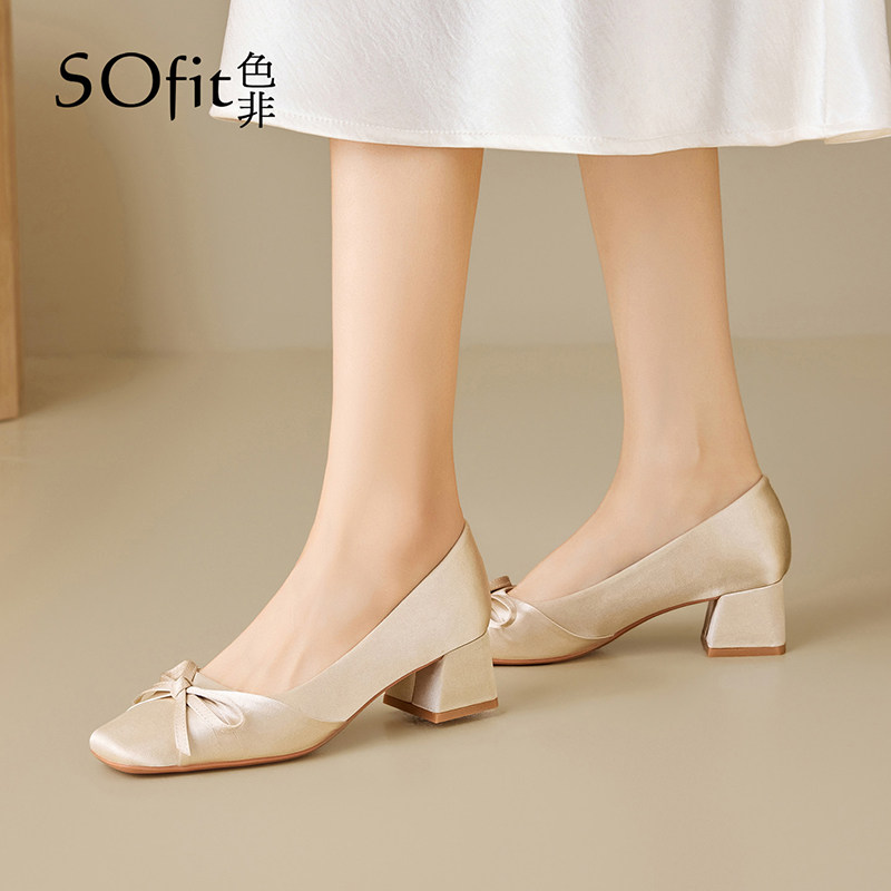 高定版~方头粗跟单鞋女2025新款红色蝴蝶结高级感新鞋浅口高跟鞋