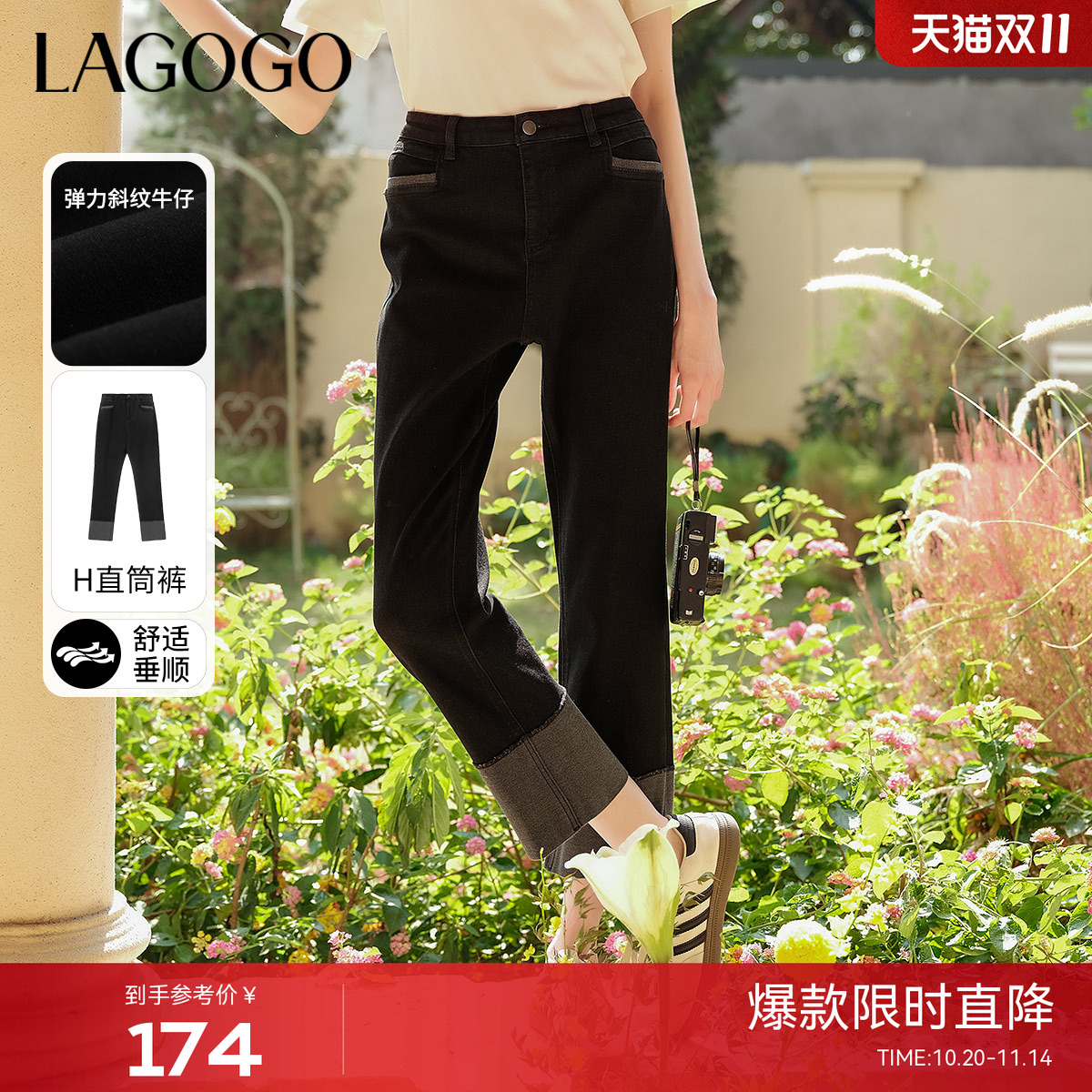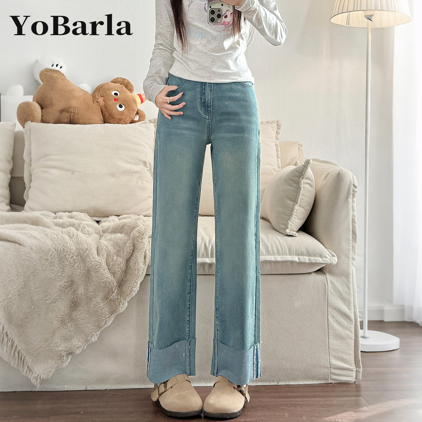 - 直筒卷边牛仔裤女