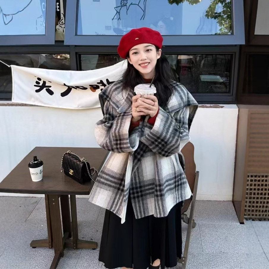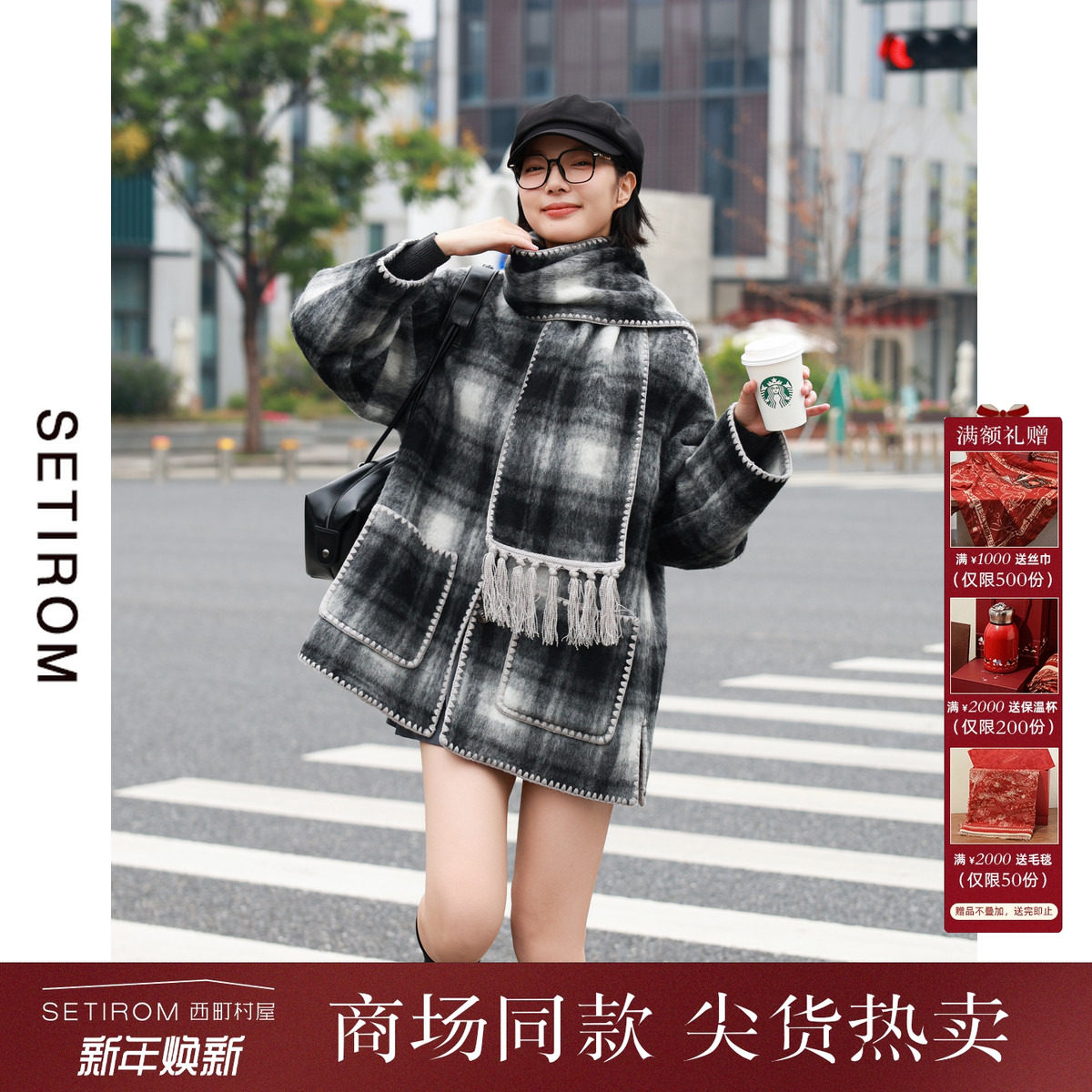 西町村屋氛围感大围巾格子大衣女秋冬新款气质短款外套XX9D10004