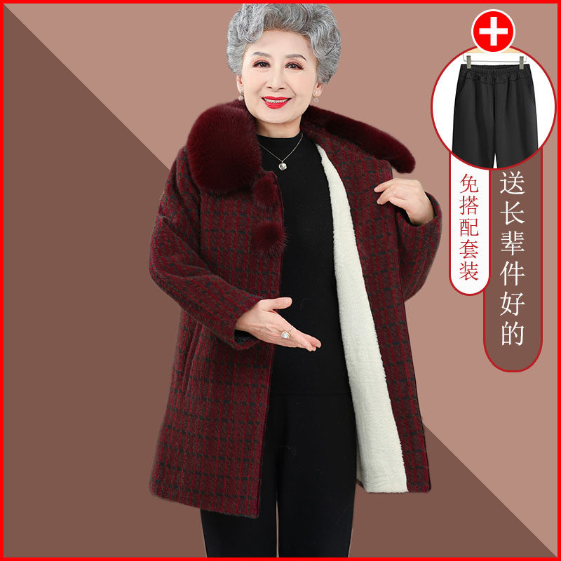 中老年人奶奶秋冬装水貂绒外套格子大衣女加绒加厚中长款棉服妈妈