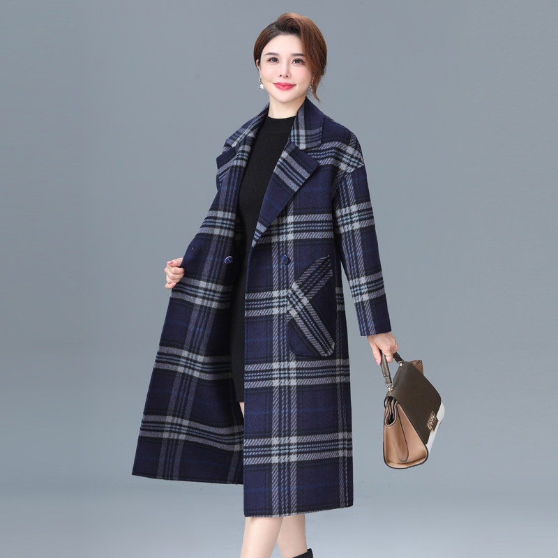 双面羊绒大码格子大衣女士英伦风洋气妈妈装中长款西装领毛呢外套