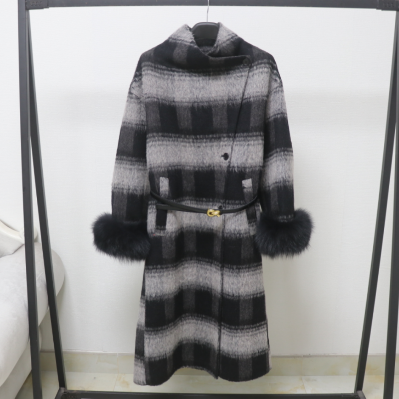 欧洲站羊毛双面呢格子大衣女保暖新款冬季狐狸毛气质宽松显瘦外套