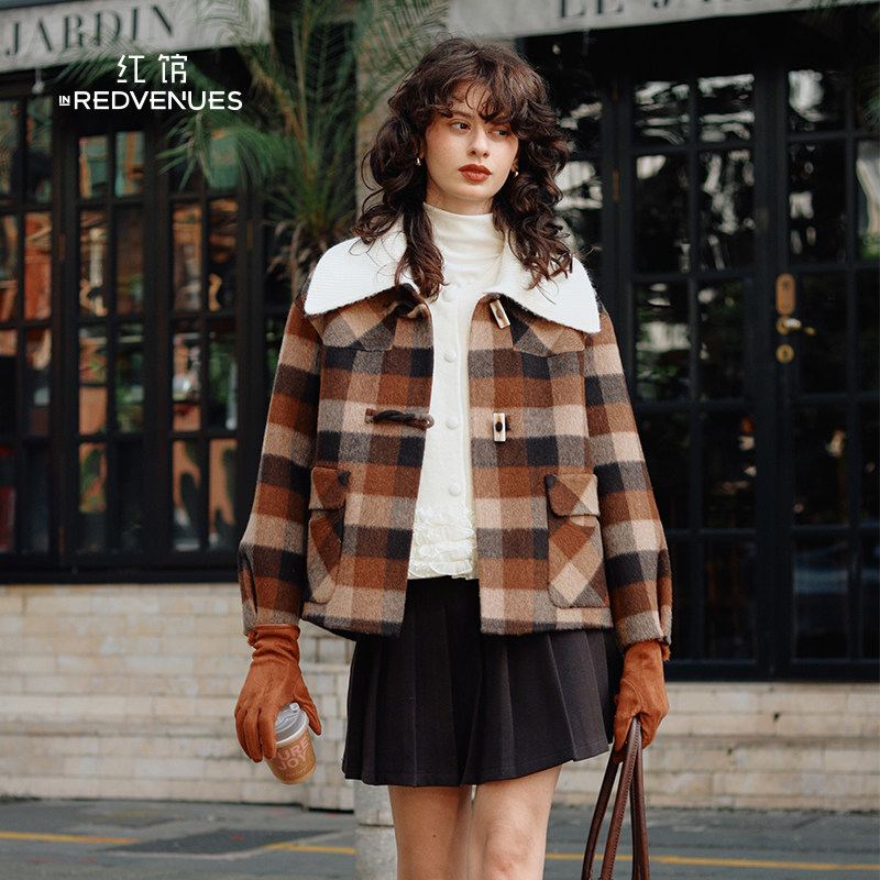 红馆|设计师款格子大衣女25冬季新款双面呢外套女绵羊毛大衣短款