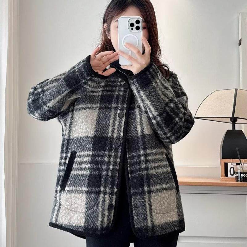 无线WUXIAN毛呢外套短款格子大衣女2025新款女小个子学生显瘦加厚