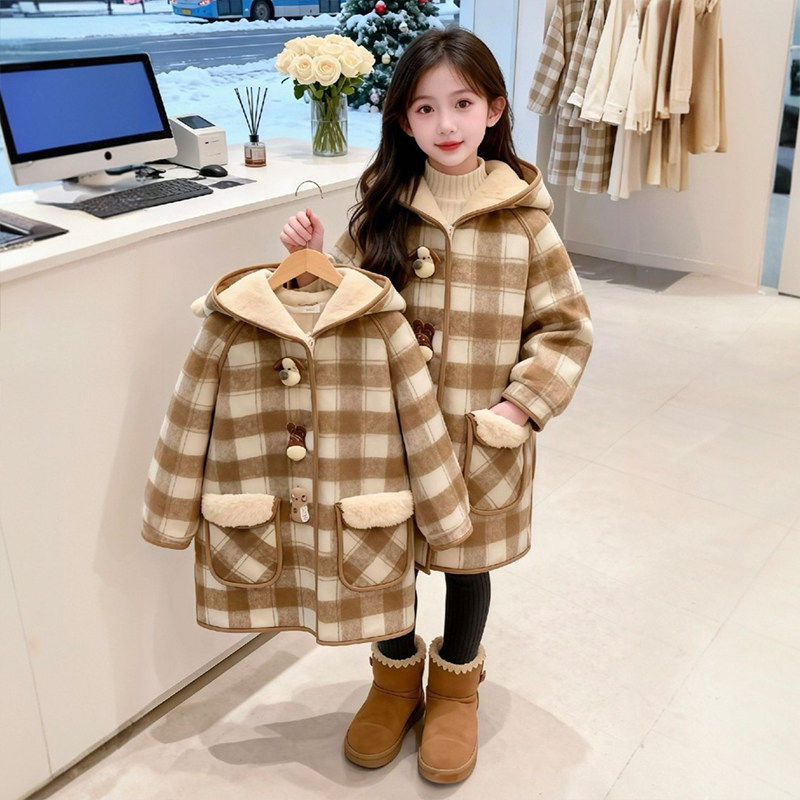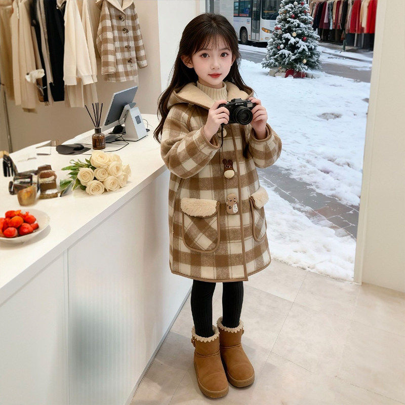 女童加绒外套秋冬款2025新款儿童洋气格子大衣女大童冬季加厚上衣