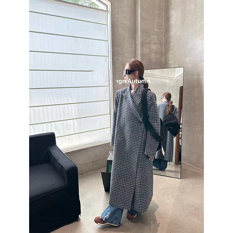 【杨黑黑】高个子长款蓝色格子大衣女 韩系斜扣宽松格子风衣外套