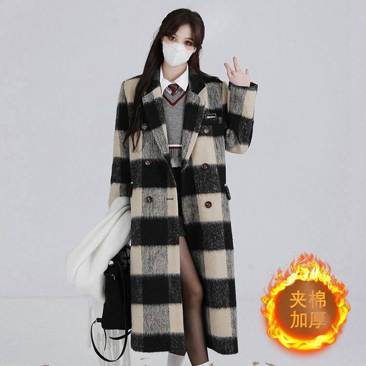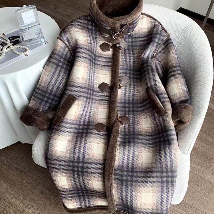 格子大衣女新款2025秋冬加绒加厚中长款仿羊羔毛小个子毛呢外套潮