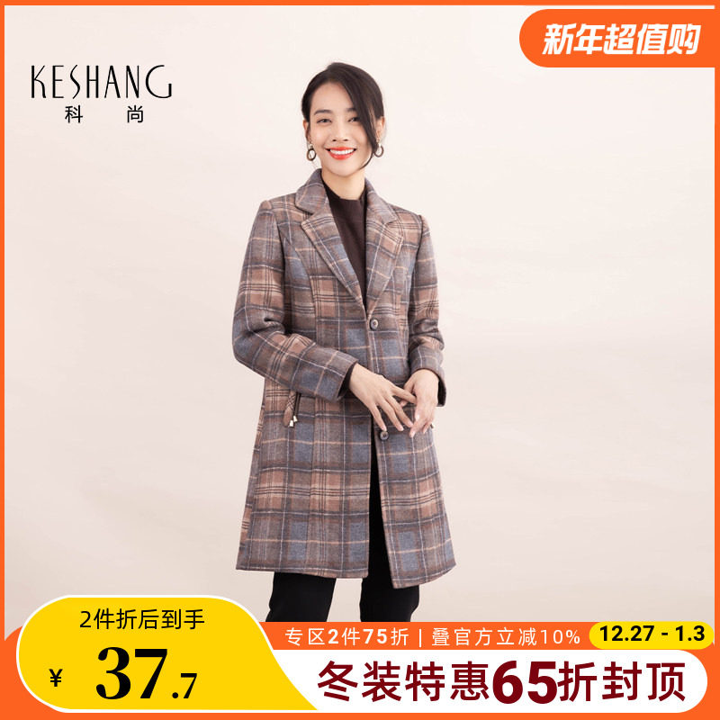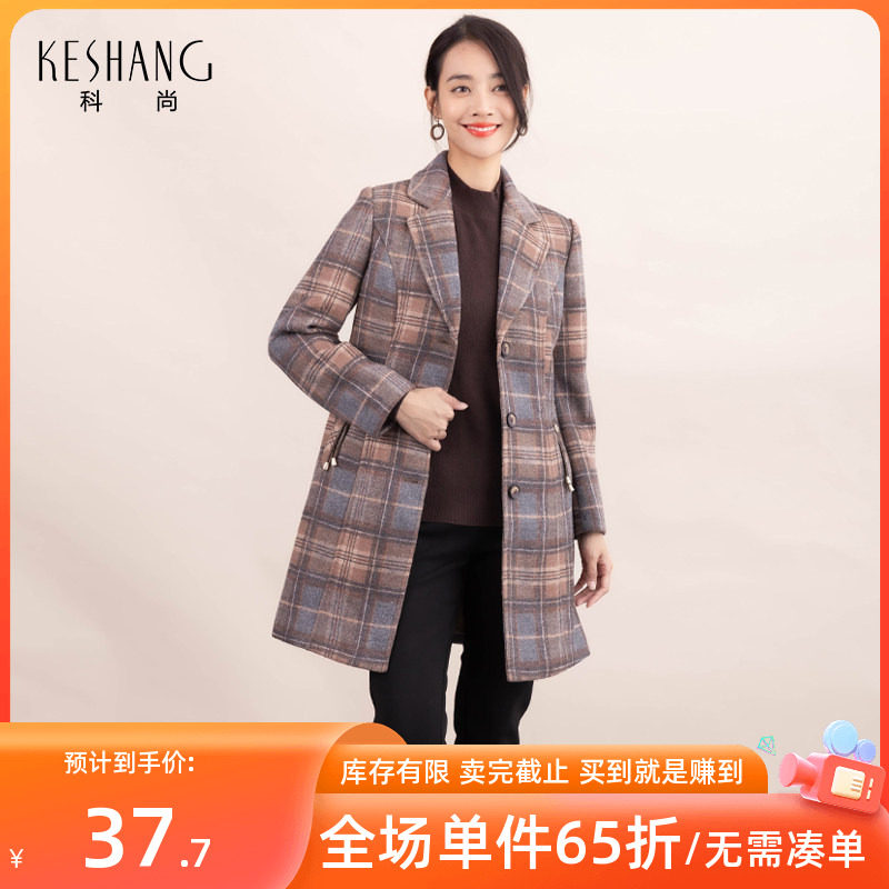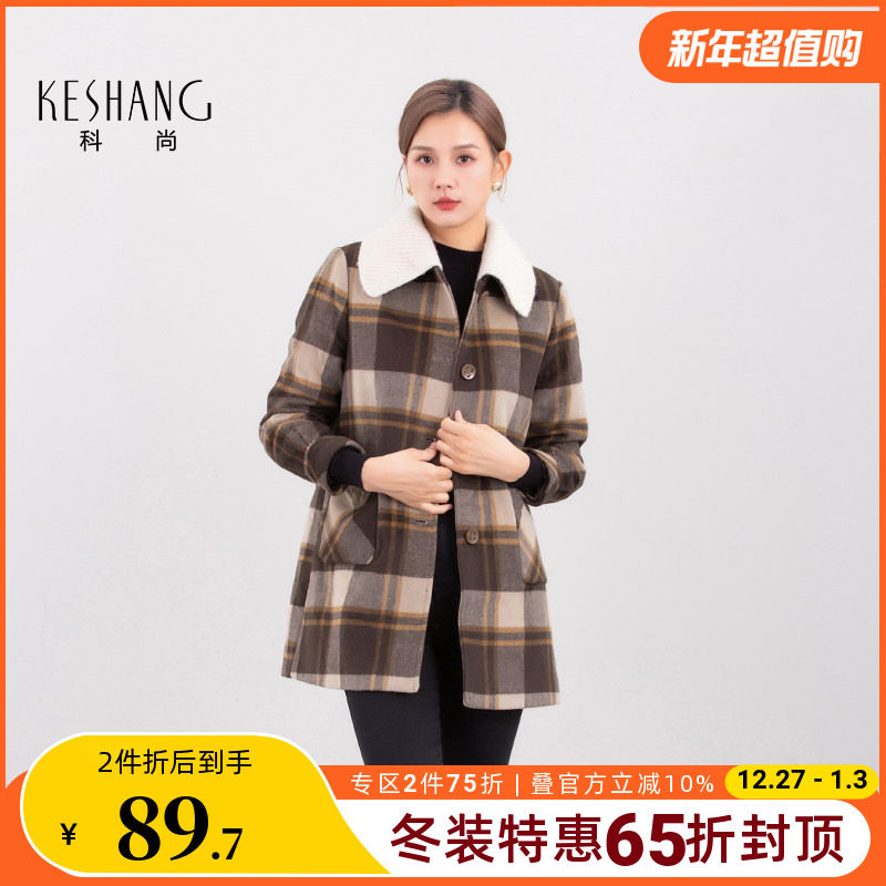 科尚格子大衣女2023冬季新款中长款气质翻领上衣加厚保暖毛呢外套