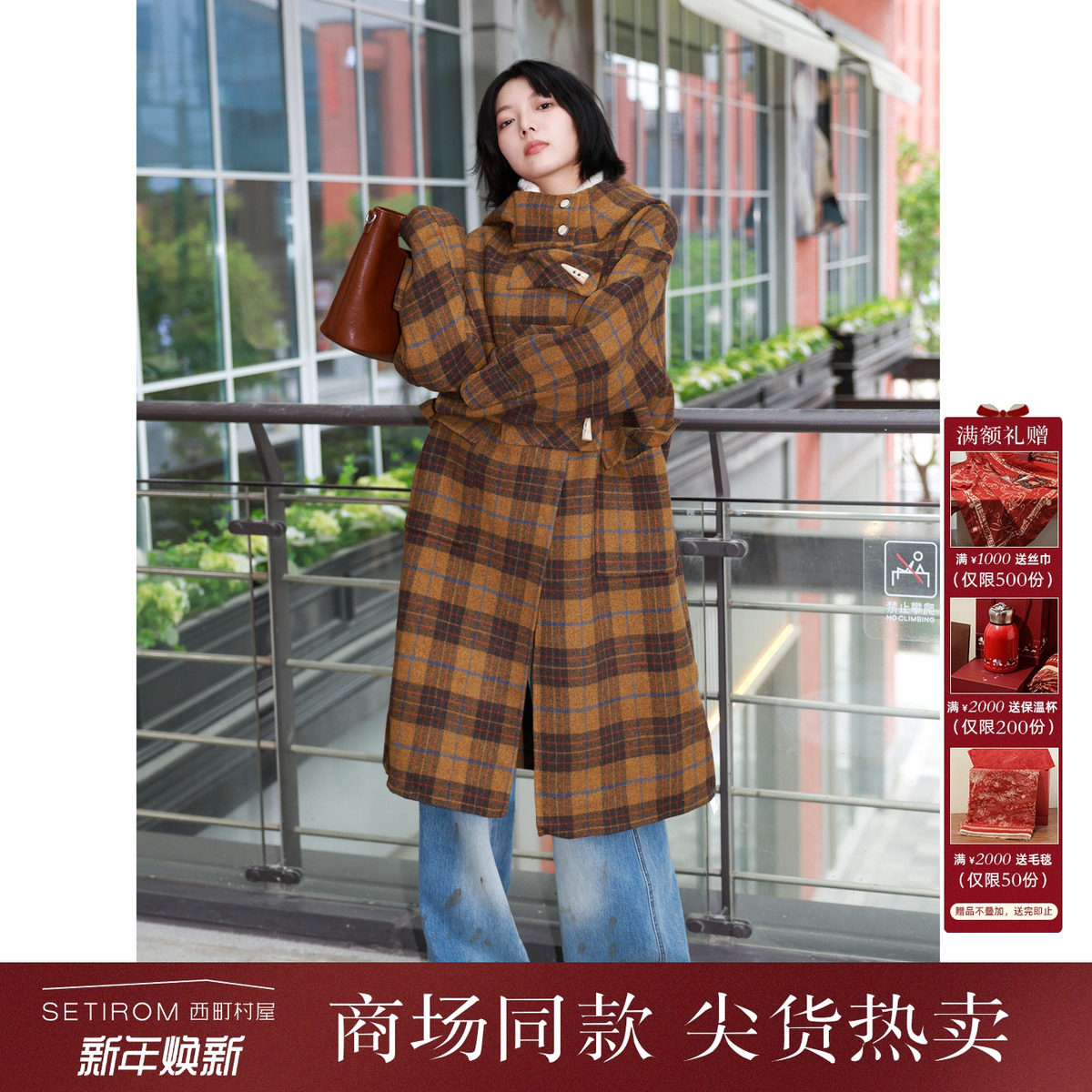 西町村屋牛角扣格子大衣女秋冬装新款复古羊绒毛呢外套AD8209001