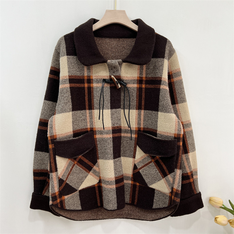 秋冬复古格子大衣女开衫大码200斤胖mm宽松圆领钉扣加厚毛衣外套
