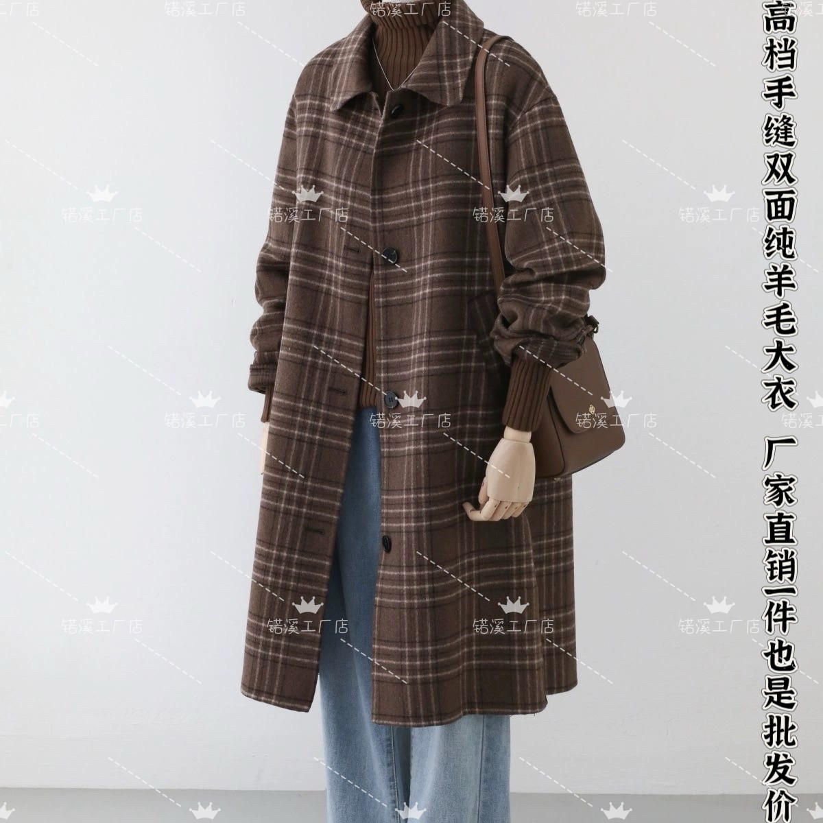韩系复古格子大衣女2025秋冬新款单排扣长款高端手工双面羊毛外套