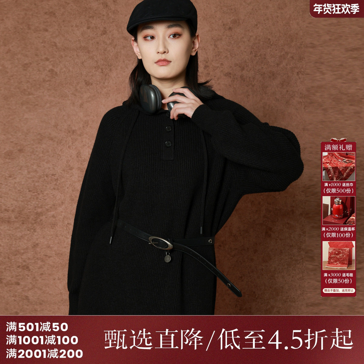 西町村屋连衣裙女冬季文艺感简约翻领开衩针织长裙HD8501298