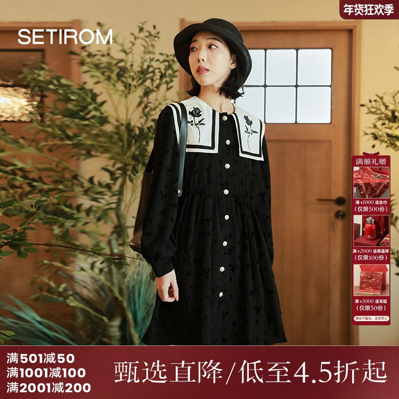 西町村屋连衣裙女百搭春款文艺法式玫瑰绣花植绒连衣裙FA8502001