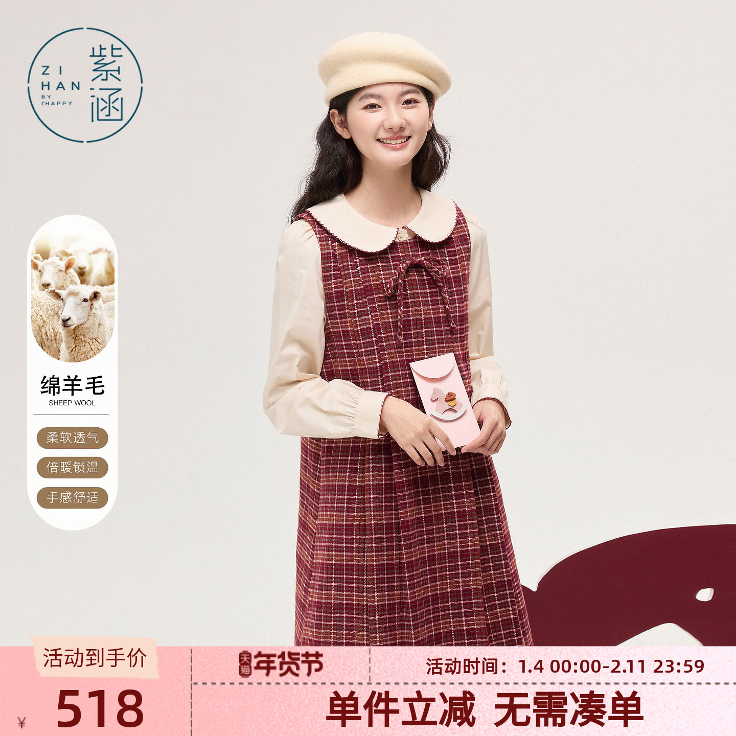 紫涵复古文艺风娃娃领衬衫红格无袖连衣裙两件套装女2025冬季新款