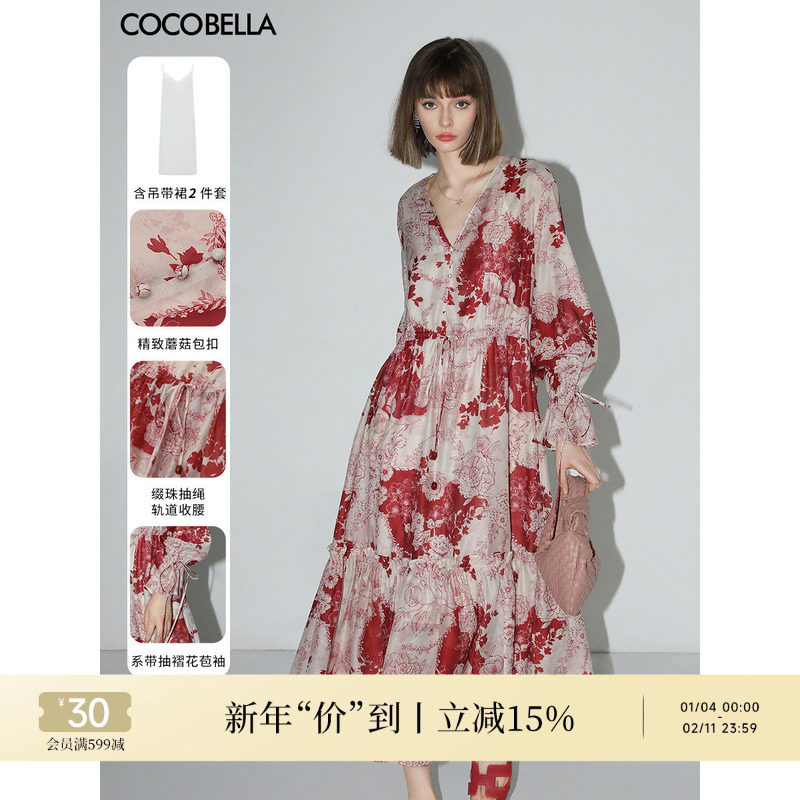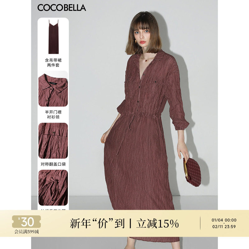 COCOBELLA重工压褶炒色长袖连衣裙系带衬衫裙吊带裙两件套FR0019