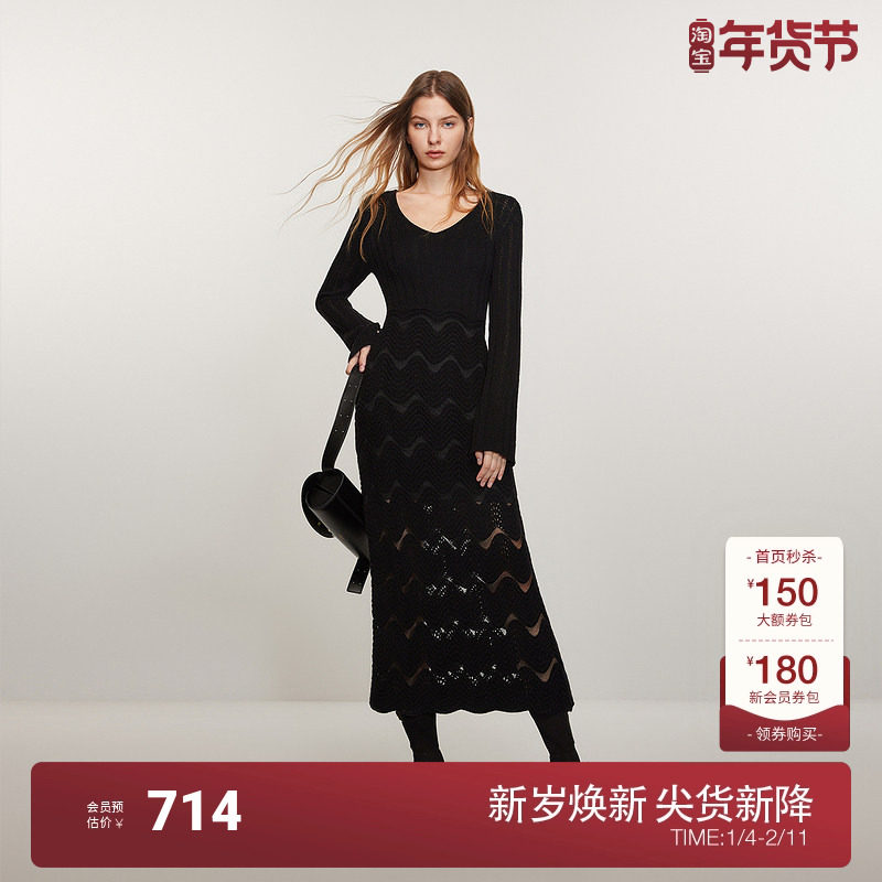 ochirly欧时力 V领镂空毛织连衣裙2024新款早春配吊带裙两件套
