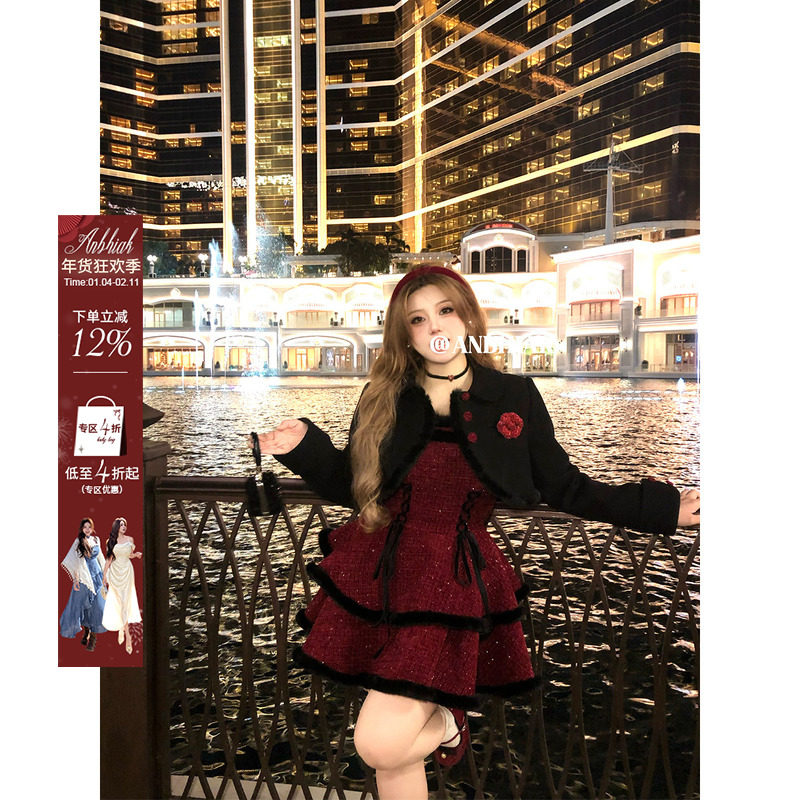 安妮不火 圣诞系列夹棉呢外套&细闪吊带裙女微胖大码氛围感两件套