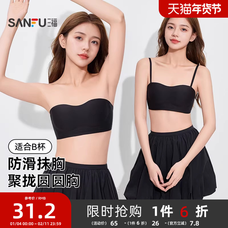 【蹦迪不掉】三福防滑无肩带文胸女聚拢无痕轻薄美背裹胸抹胸内衣