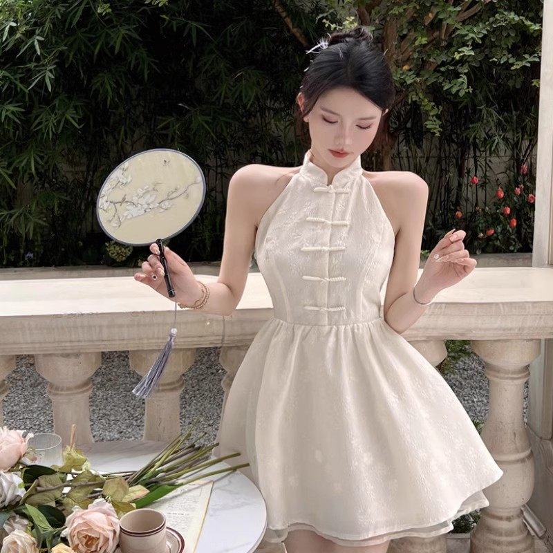 新款复古盘扣改良少女旗袍裙新中式挂脖漏肩无袖收腰显瘦连衣短裙