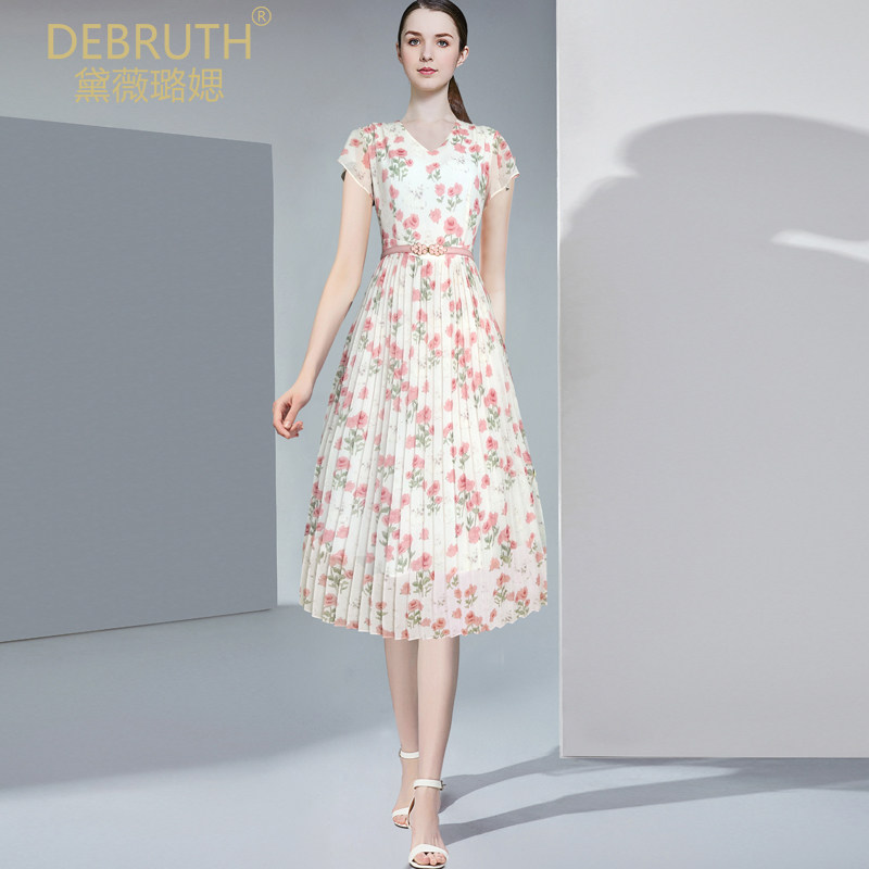 黛薇璐媤荷叶袖印花雪纺连衣裙女春夏新款中长款气质收腰百褶裙粉