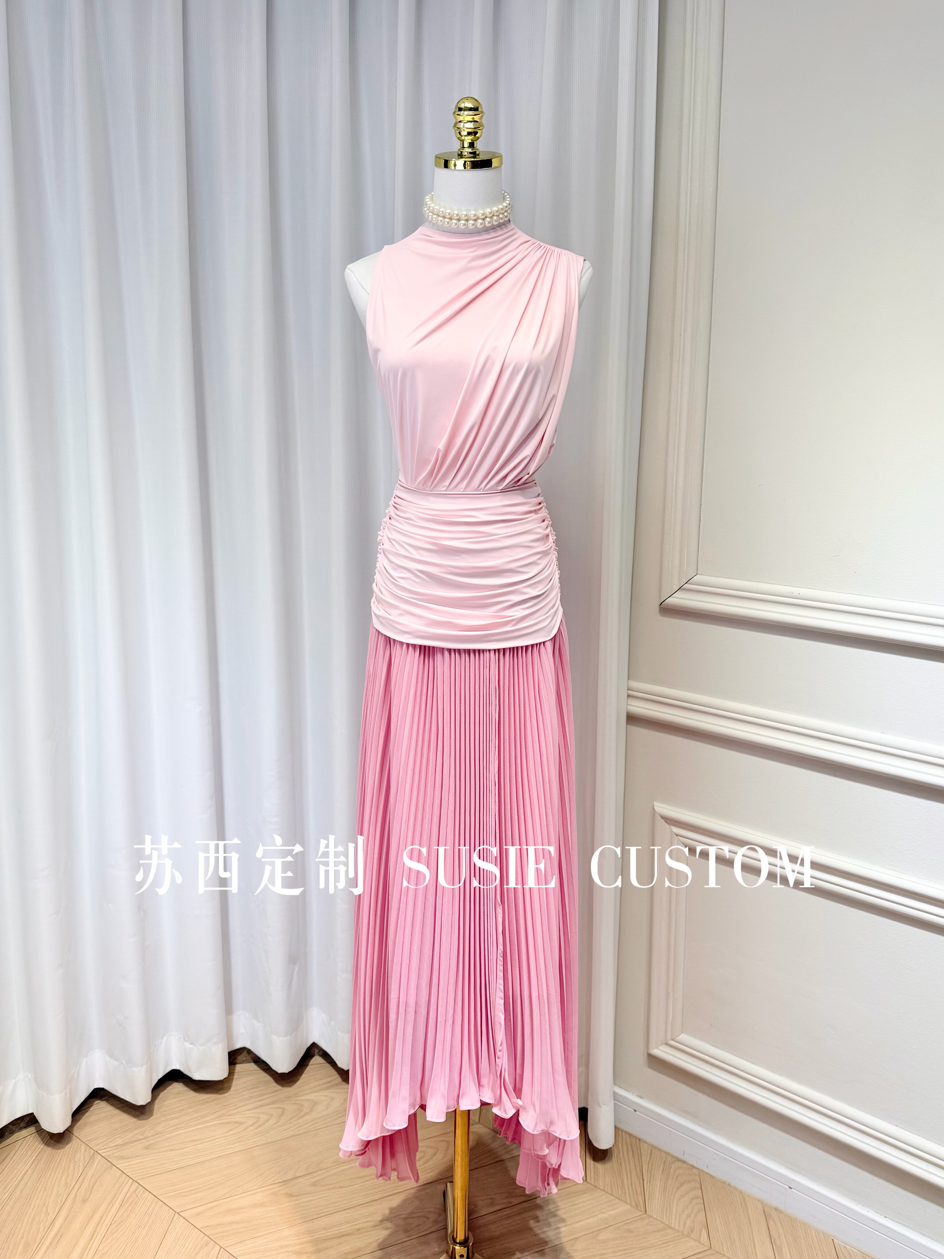 2025灵动女神重工雪纺质感三宅风立体百褶挂脖无袖连衣裙女春季