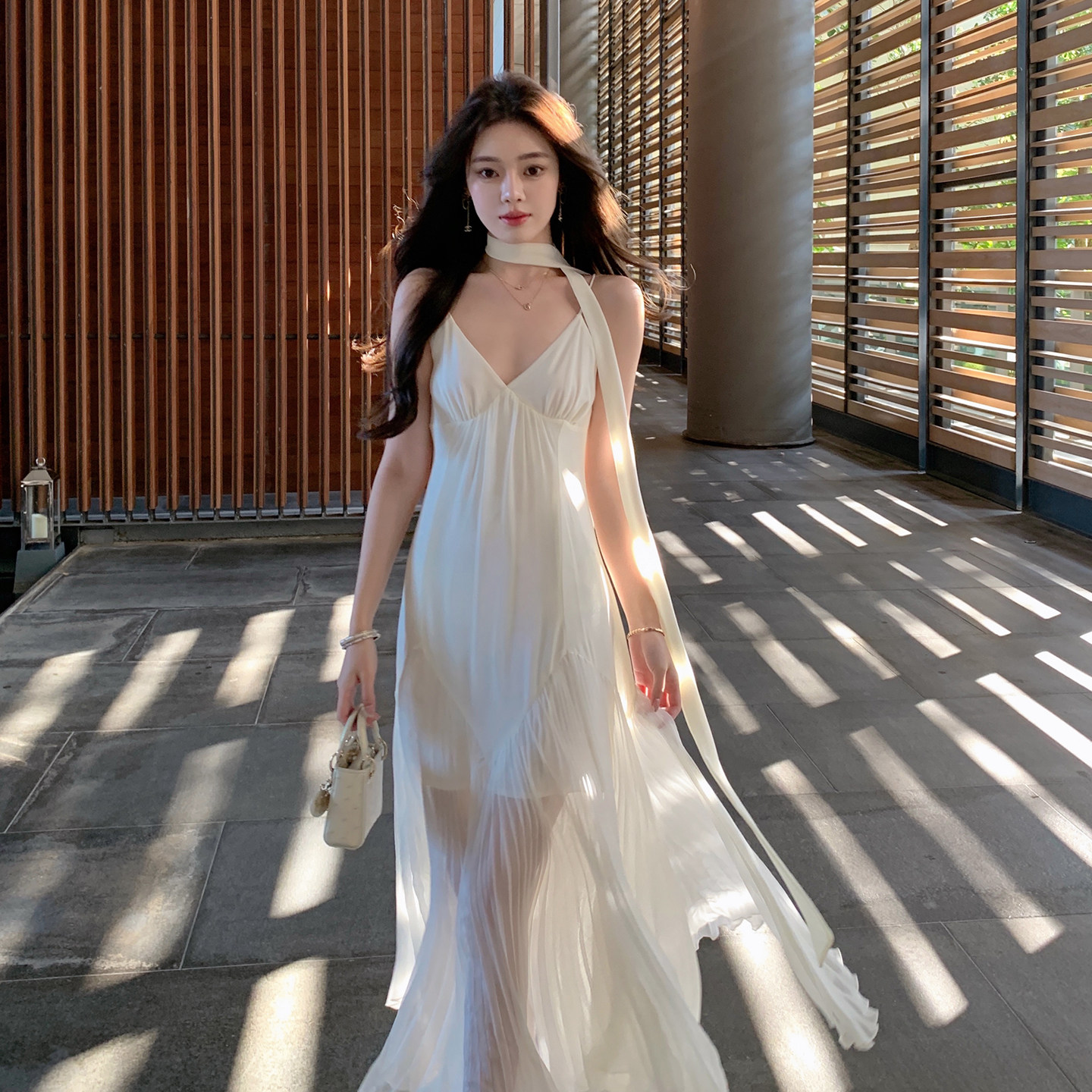 2026夏季新款气质静奢风绑带方领收腰拼接百褶雪纺裙拖地沙滩长裙